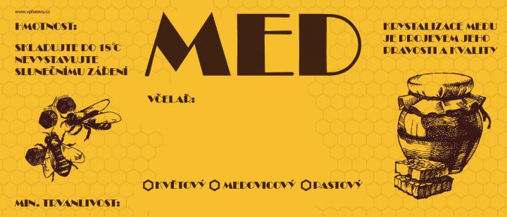 Samolepící etiketa na med o rozměru 116 x 52 mm v barevném provedení. Etiketa je určena na nalepení na sklenici s medem. Před nalepením je nutné strhnout krycí papírek na druhé straně etikety. Po nalepení je již problém ji strhnout a může dojít k jejímu nenávratnému poškození.