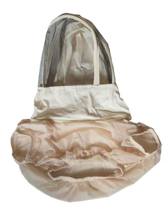 Včelařská ochranná kukla se síťkou s gumovými poutky a kapucí a také ochranou krku prostřednictvím keprové tkaniny na zádech.